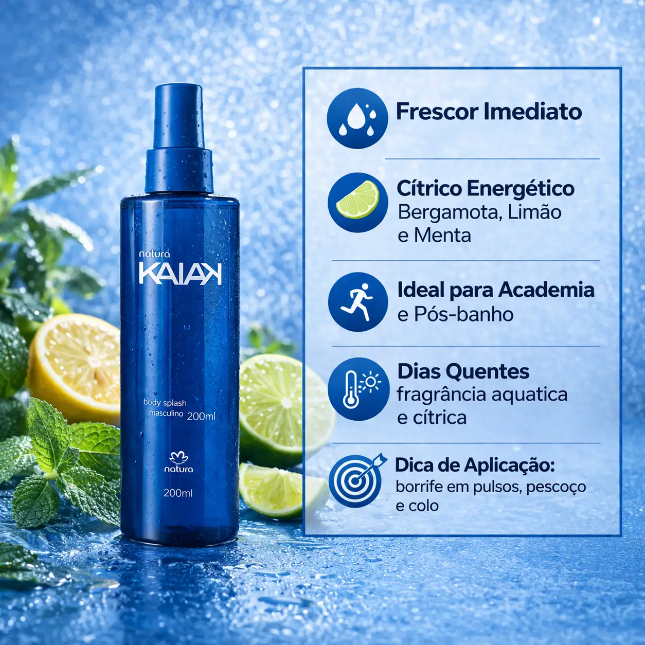 Se a sua ideia é encontrar um body splash masculino fresco, fácil de usar e com aquela sensação gostosa de limpeza prolongada, eu acho o Kaiak Masculino uma escolha muito segura. Ele traz bergamota, limão e menta logo na saída, o que deixa o cheiro mais vibrante e energético, depois passa por um corpo mais aromático e termina com musk e sândalo, que ajudam a dar conforto e um fundo masculino mais agradável. É o tipo de fragrância que funciona muito bem para quem quer ficar cheiroso no dia a dia sem pesar, especialmente depois do banho, em dias quentes ou antes e depois da academia.